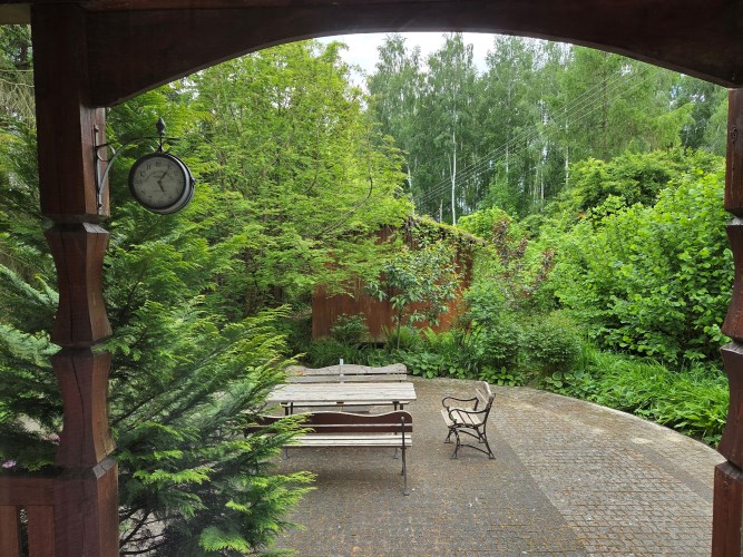 Z salonu wychodzi się na duży, wybrukowany, zachodni taras otoczony ogrodem. Idąc w kierunku stawu mijamy jeszcze murowany grill obok altany a także miejsce spotkań przy stole. Także przed domem znajduje się zadaszony taras utwardzony kostką brukową w otoczeniu pachnących bzów, magnolii i tulipanowców.