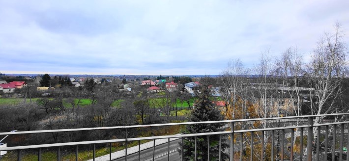 Przy większym pokoju jest duży balkon z widokiem na tereny zielone. Na podłogach jest wykładzina z PCV a w łazience - płytki.