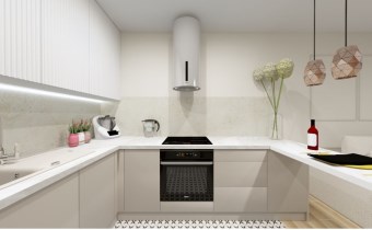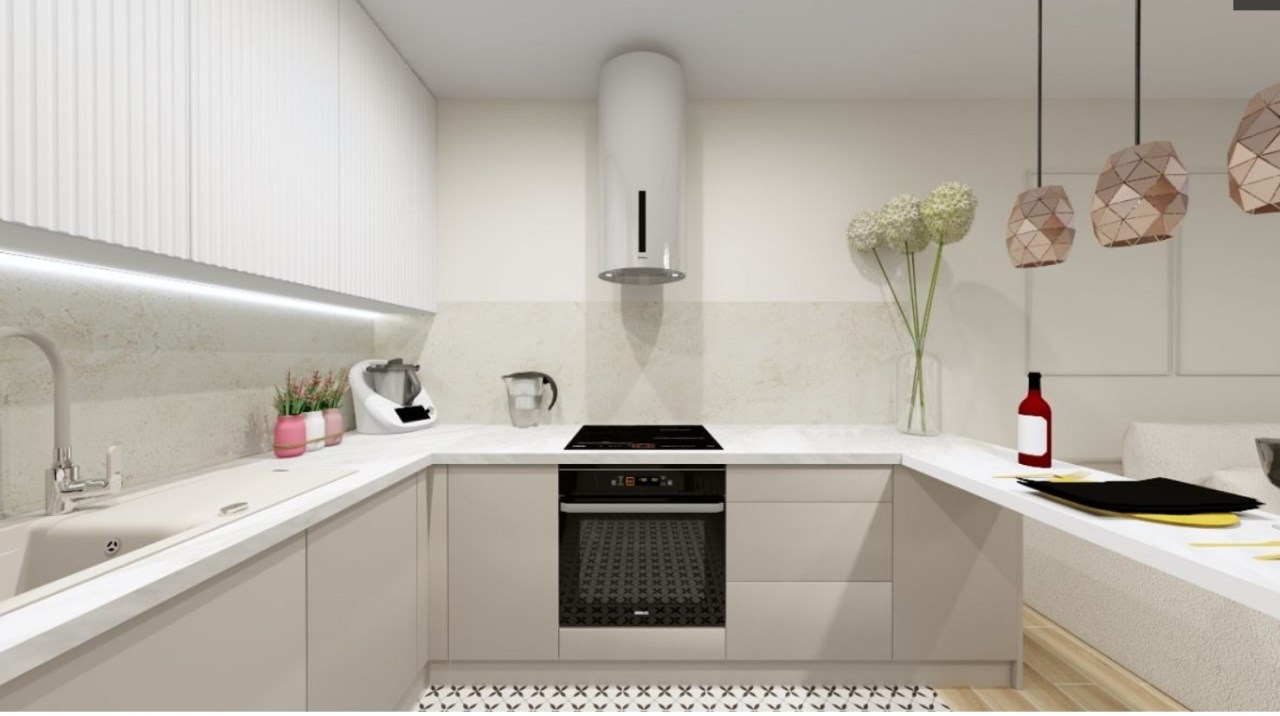 Kuchnia zyskała zabudowę nowe AGD: piekarnik, płytę indukcyjną, zmywarkę i okap.