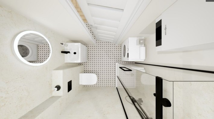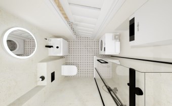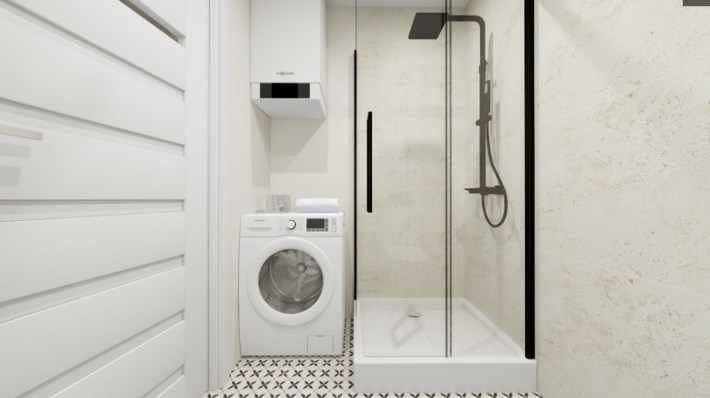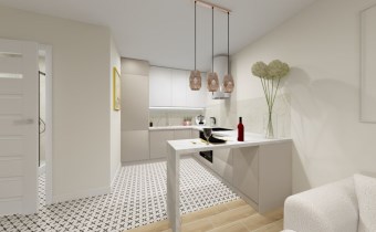 Składa się z pokoju dziennego z aneksem kuchennym i balkonem, sypialni oraz łazienki (z kabiną prysznicową i WC).