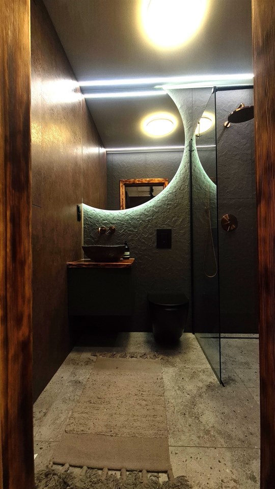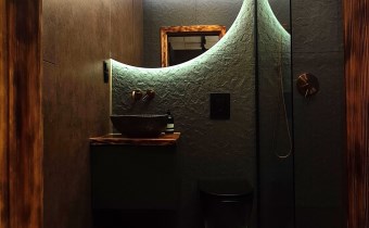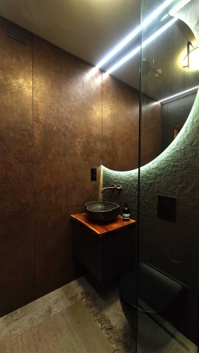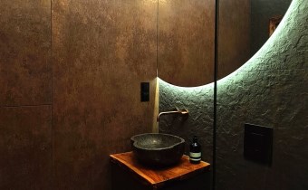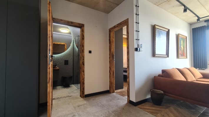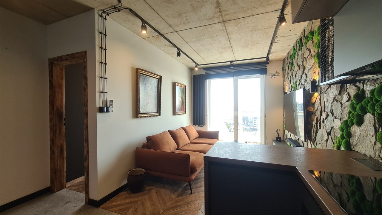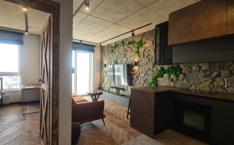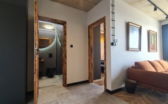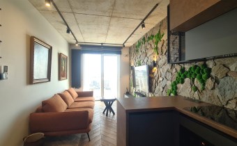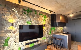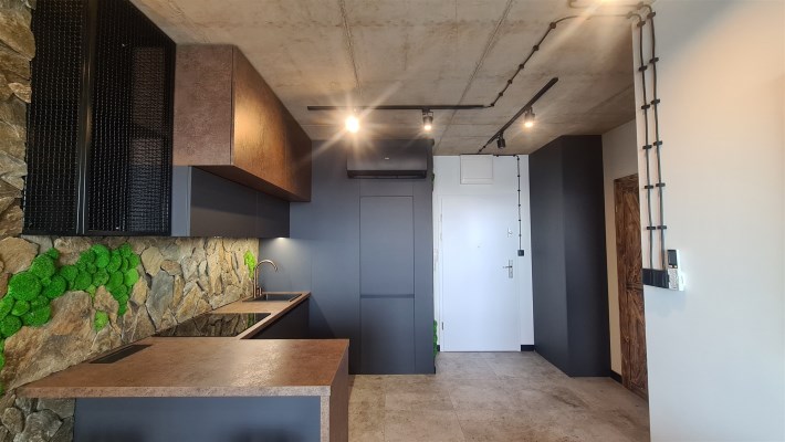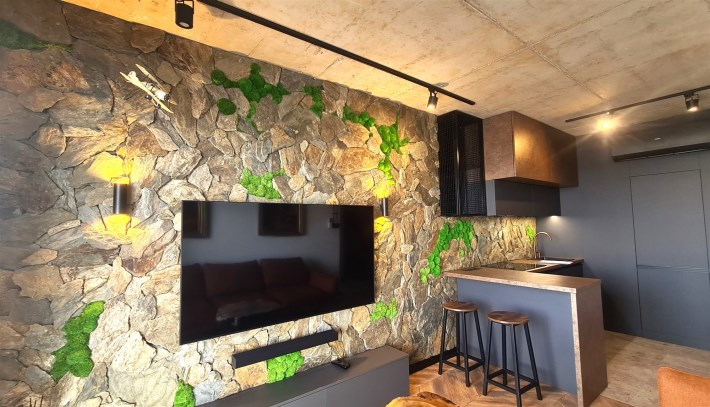 Wyróżnia je przemyślane, spójne wykończenie a uwagę przykuwa już od wejścia dekoracyjna ściana wykończona łupkiem i mchem. Loftowe oświetlenie rozprowadzono po betonowym suficie.