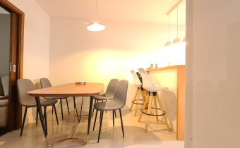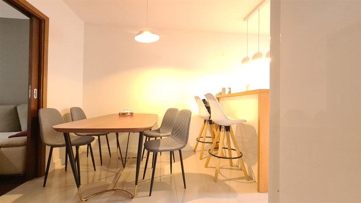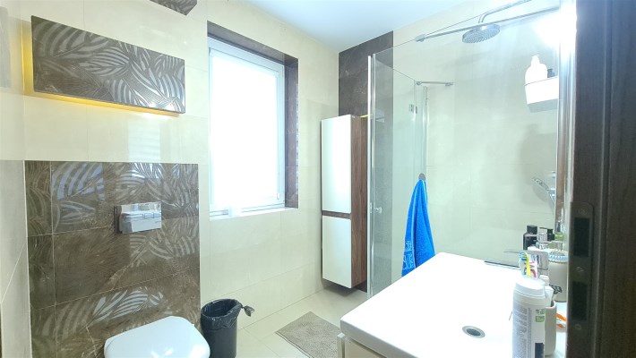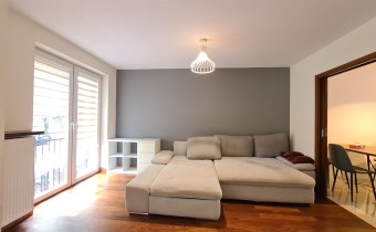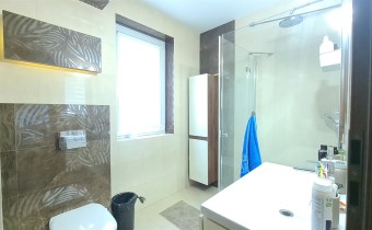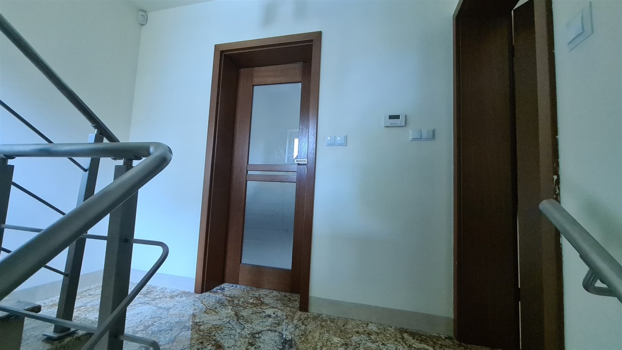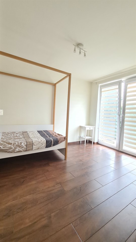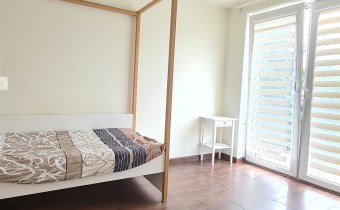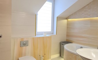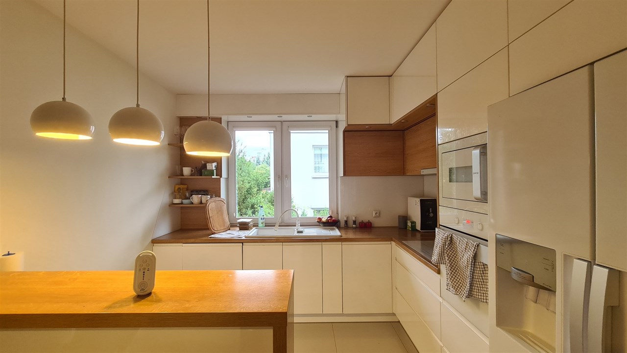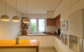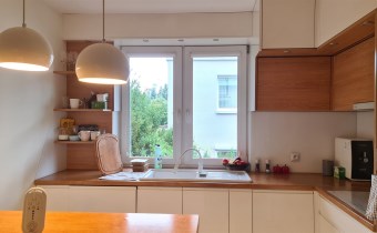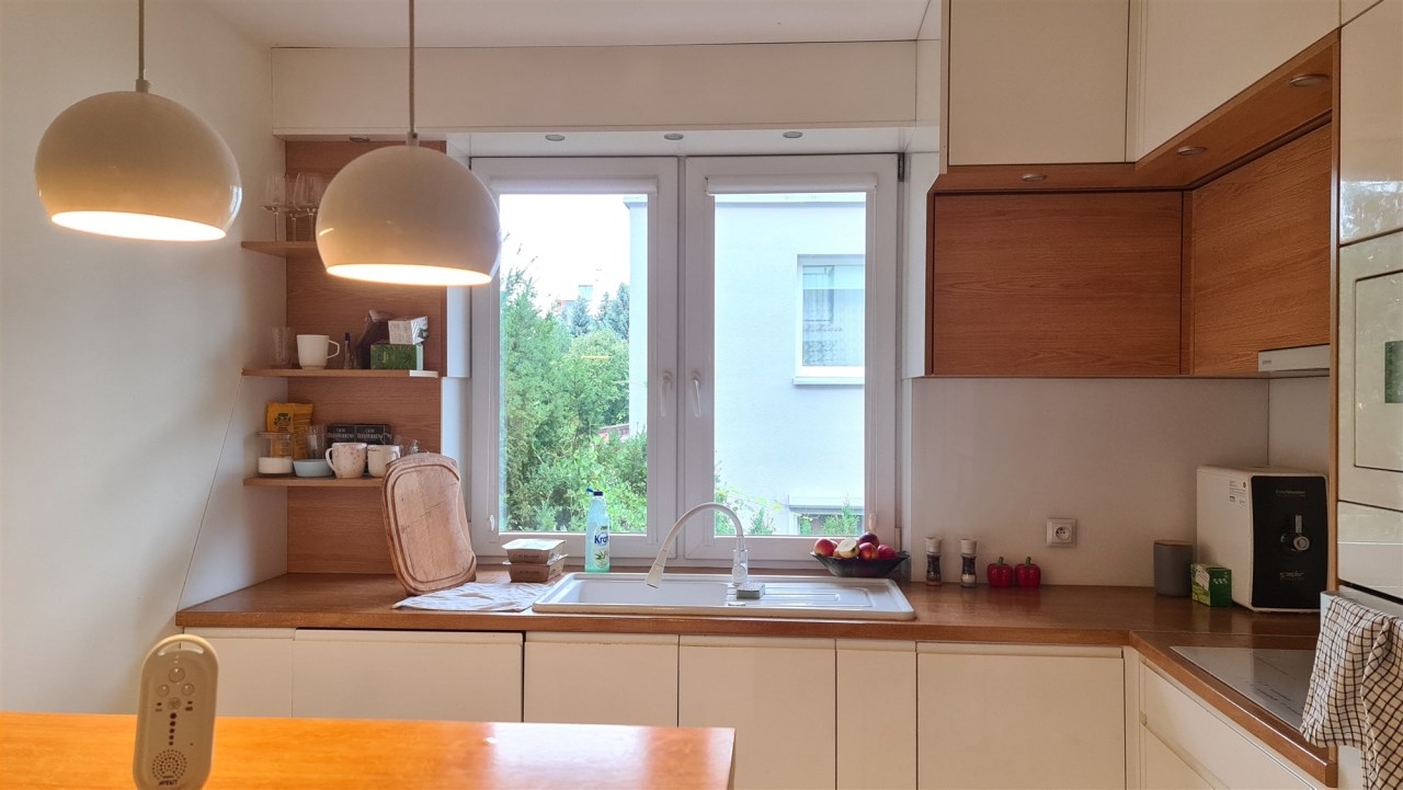 Mieszkanie jest umeblowane a kuchnia kompletnie wyposażona - m.in. w  2-drzwiową lodówkę, mikrofalówkę itp. Południowe, duże francuskie okna na piętrze pięknie doświetlają przestronne wnętrza.